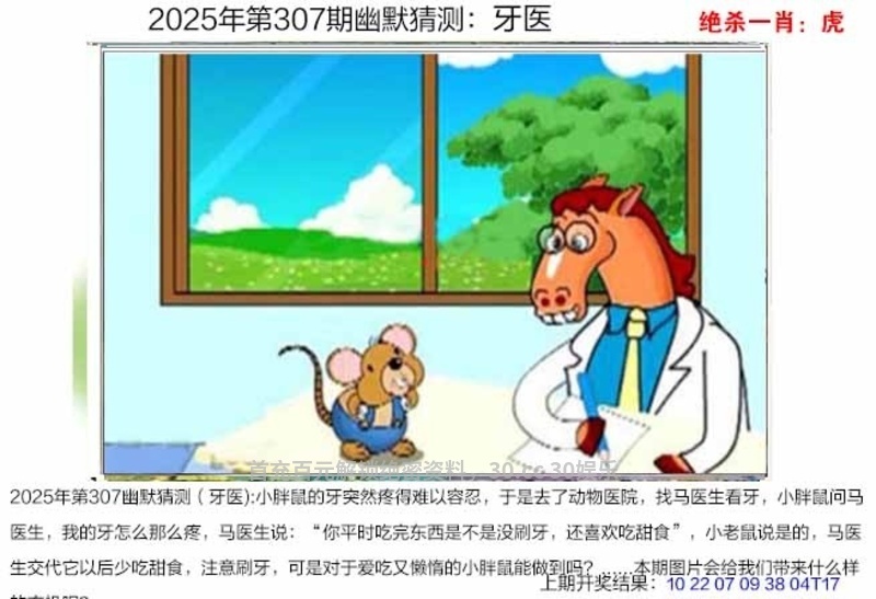 307期图片猜测(牙医)【开:發00】 小胖鼠的牙突然疼得难以容忍,于是去了动物医院,找马医生看牙,小胖鼠问马医生,我的牙怎么那么疼,马医生说:“你平时吃完东西是不是没刷牙,还喜欢吃甜食”,小老鼠说是的,马医生交代它以后少吃甜食,注意刷牙,可是对于爱吃又懒惰的小胖鼠能做到吗?......本期图片会给我们带来什么样的玄机呢? 解:马医生解后肖马羊猴鸡狗猪幽默猜测推荐六肖:狗猪马羊猴鸡本期猜测看好十码:20.44.19.43.36.48.11.35.34.45点击注册30.cc娱乐城3090.com大额无忧 |